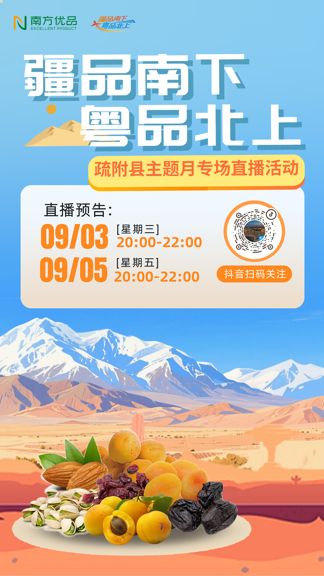 金秋九月,硕果飘香。在这个收获的季节,“疆品南下 粤品北上”线上主平台将于9月1日至30日推出疏附县主题月活动,让湾区民众足不出户感受西域好“食光”,更以产品为媒,串起两地的经济脉络与文化情谊。