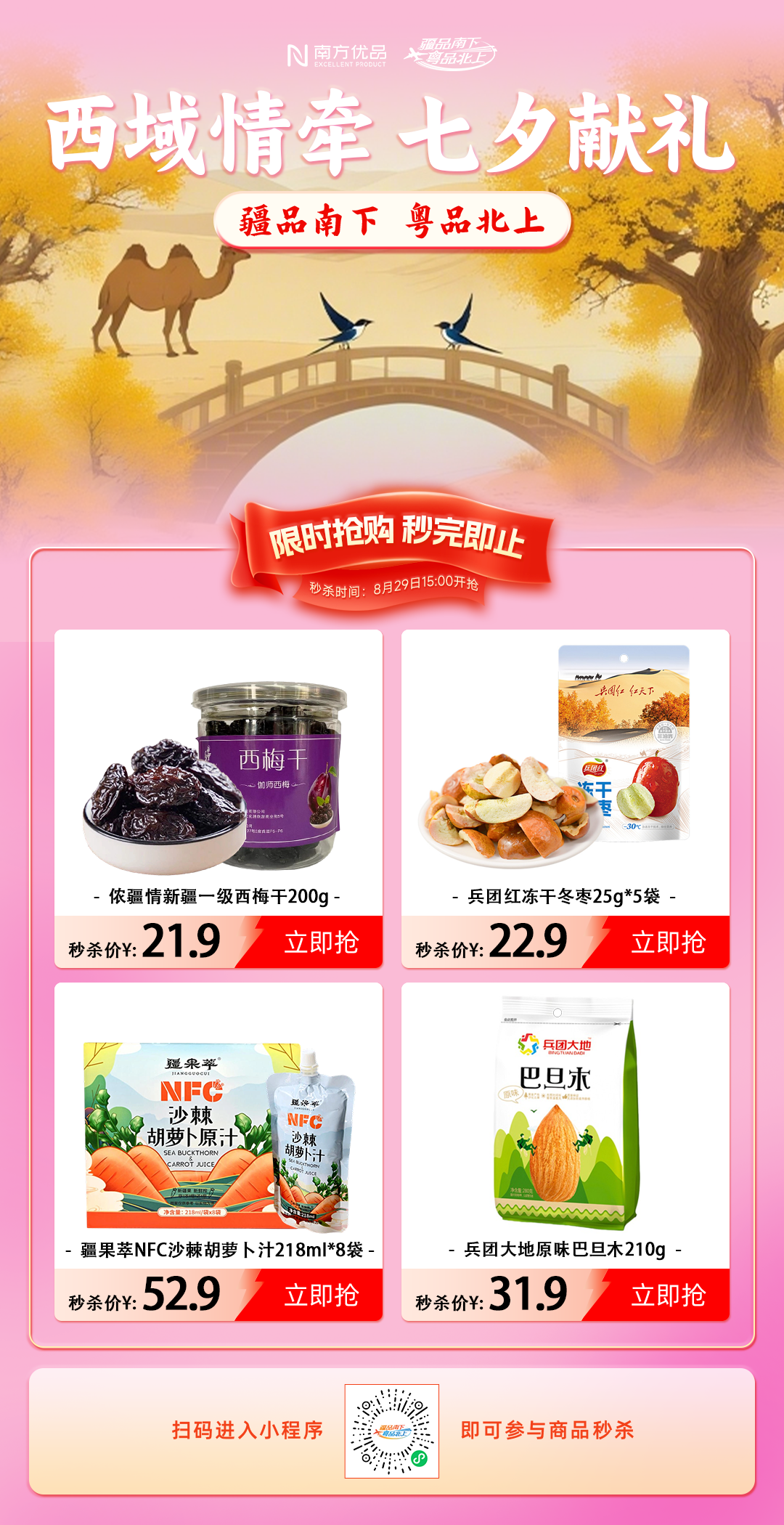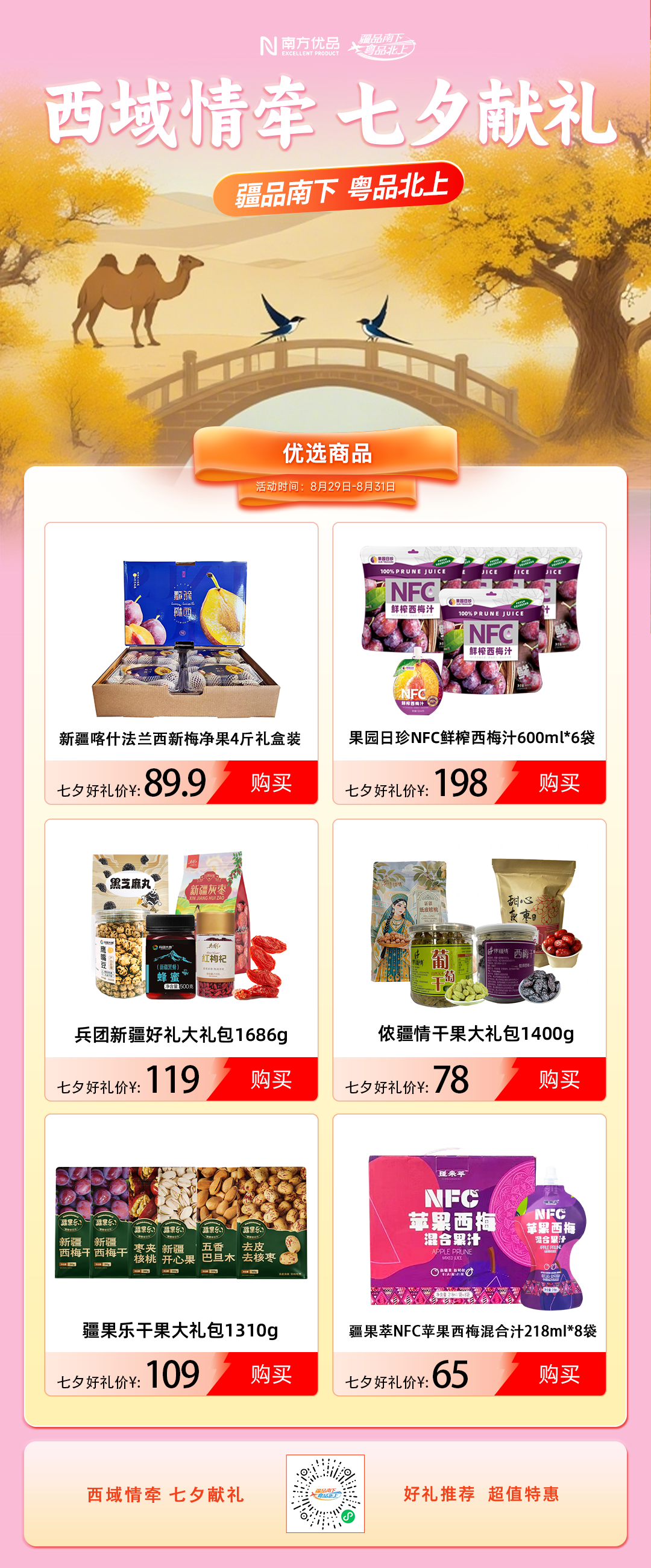 最好的爱,不仅是陪伴,更是把远方的美好,送到彼此的手边。七夕节至,锁定“疆品南下 粤品北上”线上平台,让伽师新梅的蜜香、伽师瓜的脆甜、西梅汁的清爽,成为你七夕故事的“甜蜜注脚”。